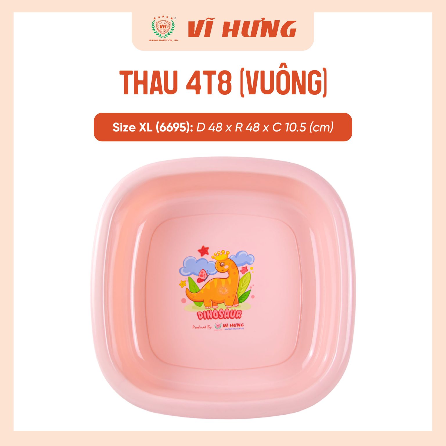 Thau vuông 4t8 – Vĩ Hưng là sản phẩm có độ bền cao, màu sắc tươi sáng. Thau được thiết kế theo kiểu vuông 4 góc khác lạ hơn so với kiểu dáng tròn thường thấy. Bề mặt sáng bóng, giúp cho người sử dụng dễ dàng vệ sinh khi cần thiết. Viền miệng được uốn hơi cong ra bên ngoài, tạo khoảng cách để cầm nắm, di chuyển dễ dàng.